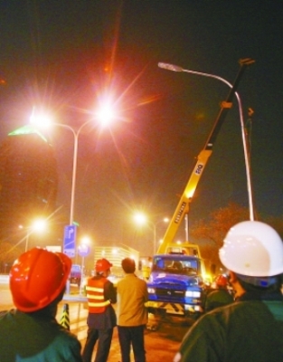 昨晚11時(shí)40分,北京長(zhǎng)安街東單北大街至建國(guó)門路段上,嶄新的13米單弧鐵桿路燈拔地而起,宣告長(zhǎng)安街路燈改造工程全面啟動(dòng)。