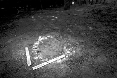 昨天上午在事發(fā)現(xiàn)場,警方勘察時(shí)撒的石灰粉清晰可見,一些物證袋封存條遺留在地上。在圍墻附近東西走向的灌木叢中,記者看到一處新翻的土堆,土堆上有兩處血跡。