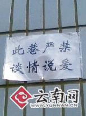 “此巷嚴(yán)禁談情說愛”,繼南京現(xiàn)“最牛公開信” 勸大學(xué)生情侶莫開房后,昨日,昆明學(xué)院昆師路校區(qū)內(nèi)的一條小巷里也出現(xiàn)了一張類似告示。