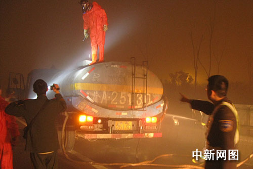 當?shù)馗咚俟穲?zhí)法部門立即關閉該高速路段上道口,避免社會車輛進入危險區(qū)域。當?shù)叵啦块T隨即趕到現(xiàn)場,通過往泄漏處噴水的方式,對泄漏的鹽酸進行稀釋。
