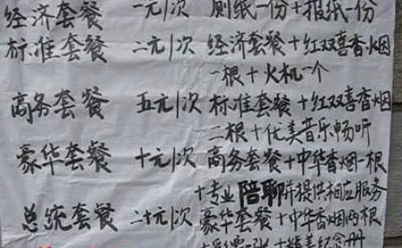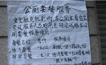 據(jù)悉,告示上將該項服務(wù)分為五個等級,分別是經(jīng)濟套餐、標(biāo)準套餐、商務(wù)套餐、豪華套餐、總統(tǒng)套餐。每個套餐還列出了各自的服務(wù)項目。例如經(jīng)濟套餐就贈送廁紙一份、報紙一份,收費也相當(dāng)?shù)土,僅僅需要一元;2元的標(biāo)準套餐則在經(jīng)濟套餐的基礎(chǔ)上送出紅雙喜香煙一根火機一個。最雷人的應(yīng)該算是價值10元的豪華套餐,竟然有專業(yè)陪聊的服務(wù)項目。而20元的總統(tǒng)套餐也讓人摸不著頭腦,居然包括彩票一張和精美紀念冊。這些都讓網(wǎng)友們好奇不已:不知道當(dāng)你如廁的時候,有人在一旁陪你談心,會是什么樣的感受?而精美紀念冊的內(nèi)容,又會是什么?