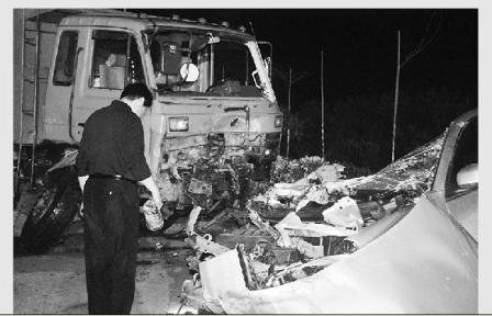 在渣土車前方,車牌號為閩A6557B的銀灰色尼桑轎車已經(jīng)面目全非,車身已被壓扁,頂蓋被削飛了出去。駕駛室里滿是血跡,旁邊的路面上也到處是血跡和油漬。