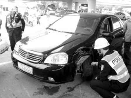 見(jiàn)狀,行人欲上前堵截,小車司機(jī)卻打正方向繞至北面正常車道。目擊者張先生說(shuō),當(dāng)時(shí)路邊還停著一輛警用摩托,可小車司機(jī)就像昏了頭,居然還徑直往上撞。隨后倒車又撞向一處橋墩,最后車輛因輪胎爆裂被迫停下。