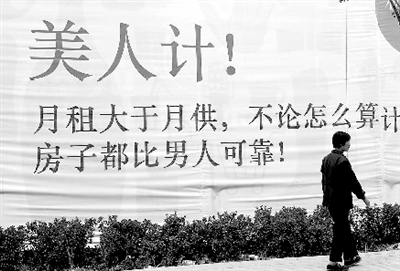 根據(jù)何先生所提供的線索,記者在河醫(yī)立交橋向西約1000米的棉紡東路上,看到了這則面朝南的巨幅房產(chǎn)廣告。白色布景的廣告墻上赫然寫著那句讓何先生不爽的廣告。該廣告美其名曰“美人計(jì)”,是為“粉領(lǐng)公寓”做的廣告,從廣告語(yǔ)來(lái)看,其目標(biāo)消費(fèi)群是女性。