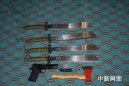 一切部署完畢后,4時40分,武裝民警分別破門而入,其中一間房內,8男1女聚集在一起正在賭賻和吸毒,另一間房內1名嫌疑人還在呼呼大睡。這伙人還沒來得及反抗,全部束手就擒。警方在兩間房內搜出一把仿“五四”式手槍及子彈兩發(fā),另有6把砍刀和1把匕首。