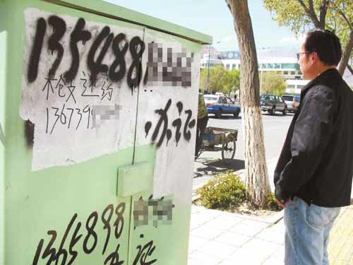 住在娘熱路附近的卓女士告訴,一些涂寫非法小廣告的人都是趁天黑或早上人比較少的時候伺機作案。他們這些人就是和管理部門‘打游擊’,很難被抓住!弊颗扛嬖V記者,拉薩是自治區(qū)的首府城市,而娘熱路是我市的一條主要干道,違法分子到處亂涂亂寫非法廣告嚴(yán)重影響了市容市貌,出售“槍支迷藥”的非法小廣告出現(xiàn)在城市中心地帶更會讓內(nèi)地游客擔(dān)心拉薩的社會治安,從而給拉薩的經(jīng)濟社會發(fā)展帶來不小危害,希望有關(guān)部門進(jìn)一步加大工作力度,狠狠打擊這些違法分子。