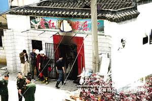 “愛紅棋牌室”西側(cè)緊挨古運(yùn)河,在一條名為“缺口河?xùn)|小街”的巷子的最里面。記者在現(xiàn)場看到,“愛紅棋牌室”東、南、北3面道路周圍都被警方用2至3道警戒線封鎖,大量警力在現(xiàn)場維持秩序。由于圍觀群眾太多,躍進(jìn)橋上的警戒線出現(xiàn)了多次被人潮擠斷的情況,民警及時進(jìn)行修復(fù)和更換。
