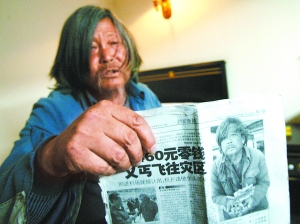 他,一名南京街頭的普通乞丐;他,曾在地震期間捐款三次感動(dòng)無數(shù)國人;他,曾坐著頭等艙作為貴賓出席新加坡華裔商人在震區(qū)希望小學(xué)的落成典禮,他就是被人親切稱為“義丐”的67歲老乞丐徐超。昨日,一位不愿透露姓名的男子將徐超接來北京,打算為其安排住處、做體檢并協(xié)助其在北京找工作安頓下來。