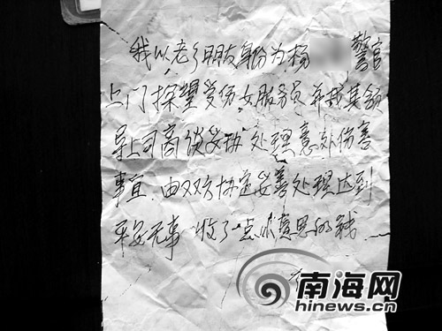 楊警官要求蔡某寫下一張收條,蔡某當(dāng)場寫道:我以老鄉(xiāng)朋友身份為楊警官上門探望受傷女服務(wù)員,并找其領(lǐng)導(dǎo)上司商談妥協(xié)處理意外傷害事宜,由雙方協(xié)定妥善處理達(dá)到平安無事,收了一點小意思的錢。