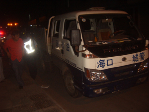 陳警官表示,丘海一橫路屬于秀英區(qū),交警馬上聯(lián)系秀英區(qū)城管大隊(duì)的有關(guān)負(fù)責(zé)人,要求協(xié)助調(diào)查。秀英區(qū)城管大隊(duì)積極配合,該大隊(duì)教導(dǎo)員王善要求隊(duì)里未上牌且當(dāng)晚出來執(zhí)行任務(wù)的執(zhí)法車輛迅速趕往現(xiàn)場。不到10分鐘的時(shí)間,現(xiàn)場就開來一輛城管執(zhí)法車輛。經(jīng)目擊市民黃先生仔細(xì)辨認(rèn),確定該車并不是肇事逃逸車輛!斑@輛車雖然沒有上牌,但是車廂兩側(cè)是用鐵皮包住的,而肇事逃逸車輛的車廂兩側(cè)上層只有鋼管,而且肇事逃逸車輛也沒這么新。”黃先生說。