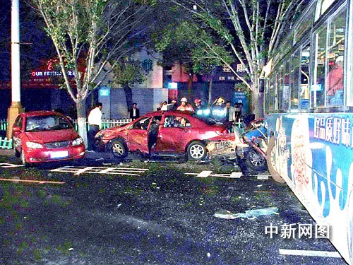 22時20分,消防官兵到達現(xiàn)場時,現(xiàn)場一輛公交車橫在馬路中間,路邊隔離帶旁三輛出租車分別不同程度的受到了撞擊,現(xiàn)場被公交車撞倒的一名行人已經(jīng)死亡,另有七名人員被分別被在三輛出租車內(nèi)。