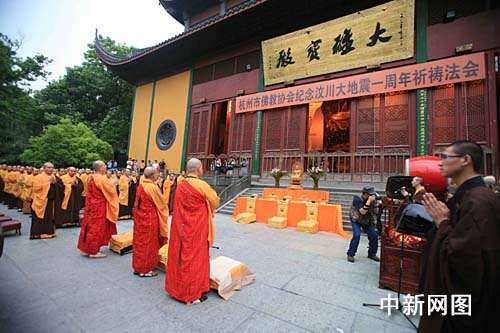 在靈隱大雄寶殿前,與會(huì)僧眾本著佛教慈悲利生的精神,為災(zāi)區(qū)人民虔誠誦經(jīng)、超度祈福,藉此表達(dá)對地震受難者的哀思、支持和激勵(lì)災(zāi)區(qū)人民重建家園的信心。