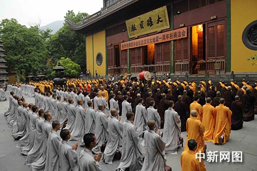 中新網(wǎng)杭州5月12日電(記者 柴燕菲 見習(xí)記者 周翌)一年前的今天,巴蜀大地一聲長嘆,舉國旗半落以致哀,笛長鳴以悲愴。一年后的今天,巴蜀大地重獲新生,如鳳凰涅磐。一年來,汶川的陣陣喘息,步步前進(jìn)都牽動(dòng)著全國人民的視線。2009年5月12日16時(shí)30分,杭州市佛教界各大寺院300余僧眾會(huì)聚千年古剎靈隱寺,隆重舉行汶川大地震一周年祈禱法會(huì)。