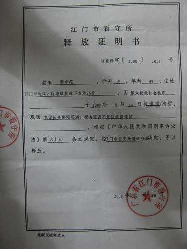 但是,對于江門日報刊登的報道,一名網(wǎng)友給本網(wǎng)提供了《行政處罰決定書》的圖片,在該圖片上可以清楚地看到,決定書上寫著“現(xiàn)查明2008年9月16日,違法嫌疑人……因?qū)T市荷塘鎮(zhèn)土地使用問題不滿,意圖到北京上訪。我民警根據(jù)此線索,于2008年9月24日10時許,在車站抓獲五名涉嫌煽動串聯(lián)、以財務(wù)誘使他人信訪,擾亂國家機(jī)關(guān)正常工作秩序的嫌疑人”,在決定書下方有被處罰人簽名和指模,以及江門市公安局蓬江分局蓋印。該名網(wǎng)友同時提出質(zhì)疑,聲明摘錄如下: