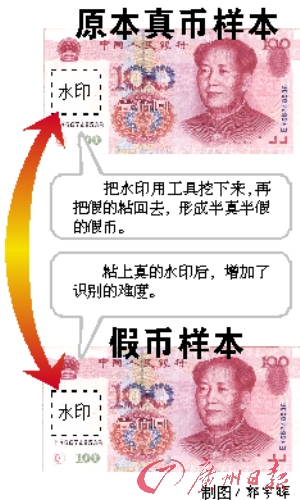 犯罪嫌疑人采用挖補方式,將真幣的水印挖出來后,用膠水粘貼到假幣當(dāng)中,原來的真幣則填充上假的水印,填充上假水印的真幣也成了假幣,“這樣100元就變成了200元,嫌疑人造出假幣后就馬上到柜員機存入假幣,再到另一個柜員機取出真幣,繼續(xù)偽造!