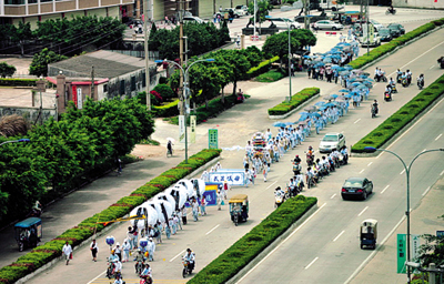 昨天下午1時20分左右,海豐縣城華夏花園住宅小區(qū)里走出一隊陣容龐大的送殯隊伍,先是數(shù)十輛摩托車魚貫而出,上了馬路后一字排開將一邊路面堵住,不讓車輛通過,為送殯隊伍讓出了一條道來;接著是敲鑼打鼓、抬花圈、扛挽幛的人,孝子孝孫披麻戴孝抬著靈柩,后面是一大批送殯的親戚朋友,一律打著太陽傘、佩戴黑袖圈;緊隨其后的是7輛豪華小車,多是奔馳、奧迪等名牌車。送殯隊伍排出了約1公里的長龍,從海豐縣二環(huán)路徒步走到海城美食街,再轉(zhuǎn)至紅城大道,摩托車隊一路“維持秩序”,確保送殯隊伍暢行無阻。直到海豐縣海城鎮(zhèn)政府附近,喪主親屬坐上中巴,將靈柩送往火葬場火化,整個送殯過程持續(xù)約40多分鐘。