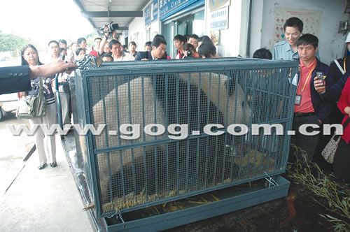 “大熊貓出來了!”載著樂水的推車剛一出現(xiàn)在貨運(yùn)部門口,立即被人們包圍。熱情的市民紛紛拿出手機(jī)或相機(jī)給樂水照相,剛下飛機(jī)的樂水低著頭,誰也不理會(huì)。經(jīng)24日先期抵達(dá)貴陽的檢查扎佐野生動(dòng)物園大熊貓館的成都熊貓基地專家、高級(jí)畜牧師吳孔菊和飼養(yǎng)員陳敏觀察,第一次乘坐飛機(jī)的樂水和珠珠沒有暈機(jī)現(xiàn)象,除稍顯有些緊張外,總體良好。