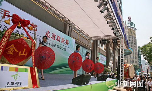 在新世界城廣場上,廊下土布時裝表演秀驚艷了南京路。一批做工精美、款式素雅、色彩純樸的江南農(nóng)村土布服飾吸引了滬上市民的眼球。風(fēng)韻十足的旗袍、藍(lán)印花布裁制的衣裙、舊時上海小姐的嫁衣,無不勾起滬人對充滿上世紀(jì)三十年代老上海情調(diào)的土布服飾的回味。