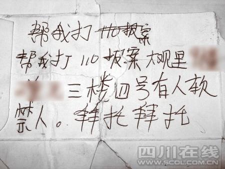 “幫我打110報案……有人軟禁人,拜托拜托。”昨日下午2點,家住成都大觀里某小區(qū)的一位大爺正在小區(qū)內散步,突然,一張硬紙條歪歪扭扭地從三樓窗戶飄落下來,大爺拾起一看,大吃一驚,立即將紙條交給小區(qū)門衛(wèi)。5名警察接警后立即出動……