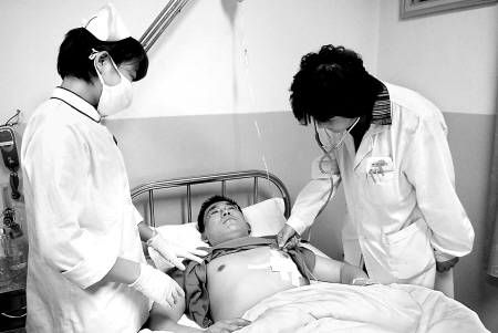 昨天晚上,記者聞?dòng)嵑笱杆仝s到西京醫(yī)院,在急診科三樓的病房里,急診外科的醫(yī)生朱金文躺在病床上,他的左側(cè)胸部上貼著一大塊白色的紗布,胳膊扎著一根針管正在輸液。據(jù)目擊者說,下午4時(shí)許,一名五十多歲的病人在幾個(gè)人的陪同下來到急診外科就診,說是在交通事故中受了傷。醫(yī)生就開始給病人做檢查,可病人的手一直捂著胸部,拒絕檢查。此時(shí),不知何因,病人打了醫(yī)生兩拳。醫(yī)生并未發(fā)火,隨后停下檢查,過了一會(huì)兒又過去查看病人。病人突然情緒失控,拿出一把小刀朝醫(yī)生胸部捅去,醫(yī)生趕緊用手壓住傷口跑到急救室。