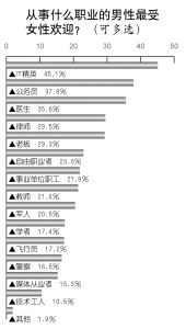 如今,從事什么職業(yè)的男性最受女性歡迎?調(diào)查中選出的十大職業(yè)為:IT精英(45.1%)、公務(wù)員(37.9%)、醫(yī)生(35.6%)、律師(29.5%)、老板(29.3%)、自由職業(yè)者(23%)、事業(yè)單位職工(21.9%)、教師(21.4%)、軍人(20.5%)、學(xué)者(17.4%)。