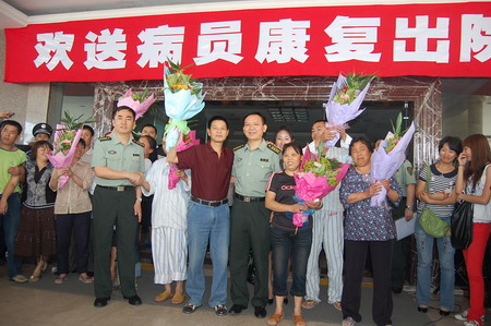 下午三點半,9名已康復的傷員在醫(yī)務工作者和家屬的陪同下走出了外科樓。四川省衛(wèi)生廳副廳長趙萬華與該醫(yī)院部分領(lǐng)導向傷員們贈送了鮮花,并握手、拍照留念。