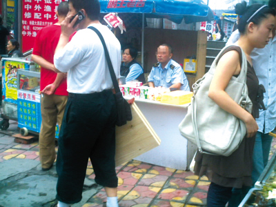 6月13日,網(wǎng)友“透明”在大渝網(wǎng)發(fā)帖稱,當(dāng)日他前往楊家坪辦事,看到一個光頭城管正在幫一個小販看攤,詫異之余用手機拍下了這一幕。記者從照片中看到,在人行道上,一個由一把太陽傘和一個玻璃柜臺組成的雜貨攤后面,該城管正悠閑地坐著,似乎很享受守攤的感覺。
