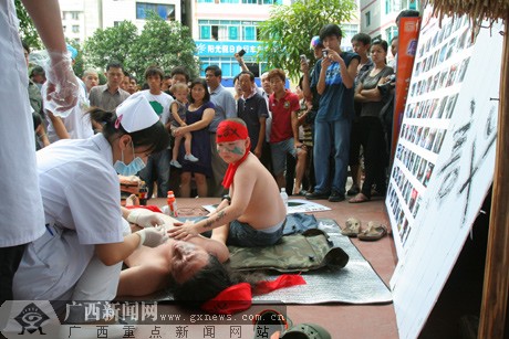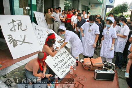 16時46分,廣西中醫(yī)附屬醫(yī)院的救護車到現(xiàn)場對商戶劉先生進行脈搏和血壓的測量,并建議馬上去醫(yī)院。在多次表明要堅持等城管相關領導來給大家做合理解釋時,商戶劉先生昏迷。在周圍群眾的幫助下,商戶劉先生被抬上救護車,送往廣西中醫(yī)附屬醫(yī)院救治。