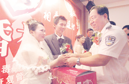 在鞭炮聲中,新郎們把身著婚紗的新娘接回康復(fù)所為他們免費(fèi)提供的新房。之后,隨著婚禮進(jìn)行曲響起,3對新人相挽著步入康復(fù)所內(nèi)布置的婚禮儀式現(xiàn)場。廣東電視臺主持人侯玉婷為他們主持了婚禮儀式,廣東省戒毒管理局局長施紅輝為3對新人證婚。施紅輝說:“這是全國戒毒康復(fù)場所的首次集體婚禮。”