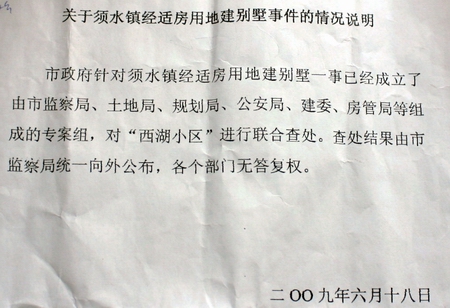 在落款時間為2009年6月18日的“關于須水鎮(zhèn)經適房用地建別墅事件的情況說明”中顯示:“市政府針對須水鎮(zhèn)經適房用地建別墅一事已經成立了由市監(jiān)察局、土地局、規(guī)劃局、公安局、建委、房管局等組成的專案組,對“西湖小區(qū)”進行聯合查處。查處結果由市監(jiān)察局統(tǒng)一向外公布,各個部門無答復權。”