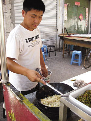鮑斌是揚(yáng)大體育學(xué)院03級學(xué)生,因為家庭經(jīng)濟(jì)困難,讀大三的時候,小鮑決定休學(xué)創(chuàng)業(yè),選擇的創(chuàng)業(yè)項目是再普通不過的蛋炒飯。他沒有向父母透露半點(diǎn)風(fēng)聲。在外面租了一間房子,開始了創(chuàng)業(yè)歷程。開始,小鮑的生意不是很景氣,后來,大伙對他的手藝認(rèn)可后,生意便開始紅火起來!拔颐刻鞙(zhǔn)備的炒飯都會比別人賣得快,所以經(jīng)常早收攤,算下來,平均一天能賣幾百盒!滨U斌一臉興奮地告訴記者,刨去成本、平常的開銷,每年掙10萬元非常輕松。因為生意越來越火,他給淮安老家的父親打了個電話,請二老過來幫忙。從此兩個老人正式給兒子打起“下手”來。