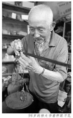 “大爺,幫我稱點(diǎn)白糖……”一名顧客喊道。只見老人從一大袋白糖中用勺子舀了一小袋,放在柜臺(tái)上的秤盤上,輕推秤砣!耙唤锒䞍桑 崩先撕暗,“二元五一斤,一斤二兩三元!”這,恐怕只是96歲的楊大爺日常生活中的一個(gè)普通瞬間吧,記者尋思。“大爺,幫我拿包藍(lán)嬌嘛……”為了進(jìn)一步驗(yàn)證人們的說法,記者說道!12元!”楊大爺從十幾個(gè)品牌的香煙中,準(zhǔn)確地拿了一包藍(lán)嬌放在柜臺(tái)上。“找你88元!”見記者拿了一張百元紙幣,楊大爺隨即回話。楊大爺把百元大鈔放到陽光下,細(xì)細(xì)查看水印,并不斷用手摸著紙幣的防偽標(biāo)志。確認(rèn)為真幣后,楊大爺迅速地給記者找了零錢。