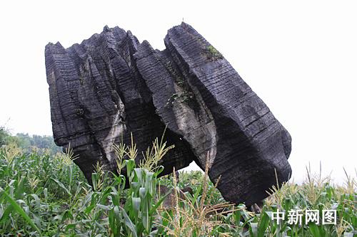 記者在長寧縣梅硐鎮(zhèn)中坪村看到,這兩塊“奇石”緊緊依偎連在一起,巋然不動地聳立在一塊玉米地中間的石灰石上,成60多度角向南傾斜;每塊“奇石”高10米左右,周長在12米以上;“奇石”底部與地面出露的石灰石基巖并未“生”在一起,而是像放在上面一樣。南(左)面的那塊石頭要“矮胖”些,與地面有兩個接觸點;北(右)面的則“苗條”些,與地面只有一個接觸點。