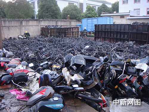 中新網(wǎng)寧波7月8日電(何蔣勇 歐陽峰)7日下午5時50分許,位于浙江省寧?h興寧中路45號的寧?h物資再生利用有限公司發(fā)生一起火災(zāi),濃煙沖天達(dá)百余米高,整個寧?h城都能清楚地看到黑煙滾滾。當(dāng)?shù)叵啦块T先后出動四輛消防車、近四十余名官兵參與火災(zāi)撲救,約40分鐘后成功將大火撲滅,但是該公司露天堆場內(nèi)近百輛廢舊摩托車被大火燒成骨架。