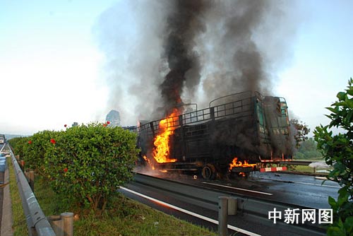 據(jù)江門市交警部門稱,27月8日05時20分,一皖籍大型貨車運載PVC管沿開陽高速公路往陽江方向行駛,行至開陽高速公路恩平市大槐路段時,與前方運載甲醇的一粵籍的重型半掛牽引車發(fā)生碰撞,碰撞后,兩車迅速著火燃燒,皖籍大型貨車車上三人當場死亡。