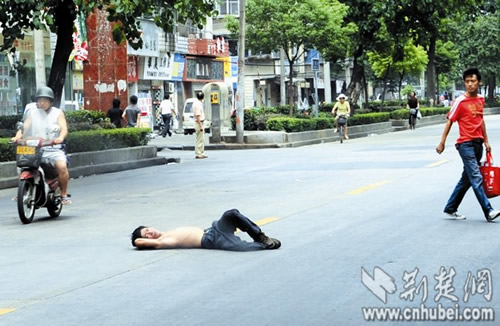 事發(fā)昨日正午,記者在漢陽郭茨口看到,一名男子上身裸露,手提一袋醫(yī)院的病歷資料,情緒激動地躺在馬路中央,脊背被路面燙得通紅。此時路面車流不息,該男子處境十分危險!翱彀阉貋恚 睅酌啡艘姞詈,靠近該男子,欲將其拉到路邊,但該男子并不領(lǐng)情,堅決不起身。幾分鐘后,二橋派出所的民警趕來,要求該男子去派出所再說,該男子置之不理。民警表示,早8時許和10時許,該男子曾在附近路面躺過兩次,都被他們帶回了派出所,他們這已是第三次為該男子出警!坝惺裁次驼f出來,那樣心里痛快點。”見民警束手無策,熱心路人們開始輪番上前勸解。眾路人汗流浹背,頂著烈日站在馬路中央,對該男子動之以情、曉之以理。半小時后,該男子陸續(xù)說出了心中的不快。又經(jīng)勸解,該男子終于答應(yīng)跟民警回派出所,將事情說清楚。
