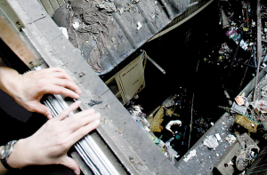 隨后,記者進(jìn)入金湯大廈三樓,從電梯間窗戶看下去,正對(duì)死者墜樓砸穿庫(kù)房的屋頂,可以看到此處垃圾較厚,全堆在屋頂上,中間被砸出一個(gè)大洞,垃圾的酸臭味很刺鼻。三樓外墻上一根鐵皮煙道被砸壞。