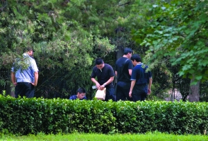 王明說,起初,藍(lán)衣男子出門后向東逃跑,跨進(jìn)了銀行旁的綠化帶,然后向南前行了幾步,隨即馬上轉(zhuǎn)身,沿反方向跑去。到達(dá)銀行對面的綠化帶時,他和保安堵住了該男子。但藍(lán)衣男子沖著二人將瓶子里的無色液體灑出,隨后繞開他們,繼續(xù)向北跑去,很快就不見蹤影。