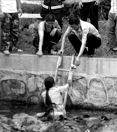 女子把放在水里的衣服重新穿上,在消防隊(duì)員的協(xié)助下爬了上來(lái)。她在上岸之前,還順便從河中摘了一朵蓮花獻(xiàn)給警察,以示“感謝”(右)。