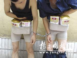 昨天下午3點半左右,兩名男子在南京建寧路一家超市里偷了4聽奶粉藏在內(nèi)褲里準(zhǔn)備偷運出超市。在超市門口被保安發(fā)現(xiàn)后,兩人四處逃竄,其中一人跑到奶粉貨架處,脫了褲子就把奶粉放回貨架上,但還是被保安和熱心的市民抓住。令人啼笑皆非的是,偷奶粉的兩名男子竟然各穿了三條女性緊身內(nèi)褲方便作案。