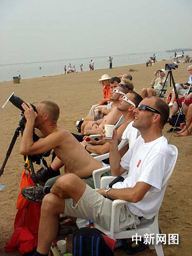 當天早晨七點左右,記者來自上海市郊的金山城市沙灘。在這一被稱為本次日全食中國最佳觀測點之一的沙灘上已經(jīng)聚集了一千多名境外天文愛好者。據(jù)悉,此次“跨國追日”活動是由上海、江蘇、云南三地的八家旅行社策劃組織的,成員分別來自美國、加拿大、意大利、西班牙、荷蘭、瑞典、丹麥、日本、泰國等國家。