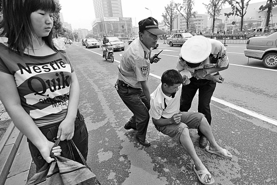 一直低著頭坐在地上的小高突然抬起頭,脫下鞋扔向人群,并嚷著“我不去!”喊完后他又蹲下來拼命地用頭撞擊身邊的石墩:“我沒有工作,我死了算了!”