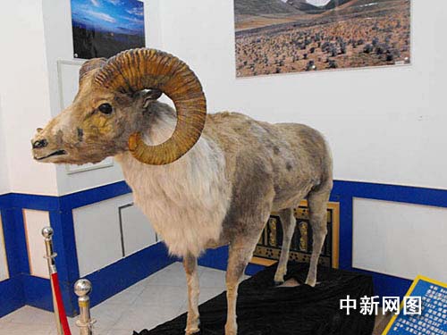 阿克塞哈薩克族自治縣縣委宣傳部熱提劍今日向記者介紹,該縣展覽館陳列的盤羊標(biāo)本是國家二級保護(hù)動(dòng)物,屬?浦畜w型最大的一種,棲息于海拔2000——5000的沙漠和山地交界的沖擊平原和山地低溝中。雄性角粗大,由頭頂向下并向后螺旋狀彎曲,幾乎可達(dá)360度,主要分布在阿克塞哈薩克族自治縣境內(nèi)于大、小哈爾騰前山和安南壩地區(qū)。
