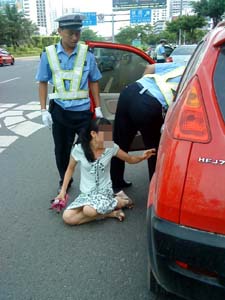 記者在現(xiàn)場看到,女司機被攔下后,交出了駕駛證,但是,當(dāng)她看到交警準備開處罰單時,立即下車,試圖搶奪駕駛證!澳阍趺粗牢覜]系安全帶,我系了。”該女子喊道。“你拐彎時看到我們交警檢查后才匆匆忙忙系的安全帶。你不用狡辯,請接受處理!崩罹僬f道。