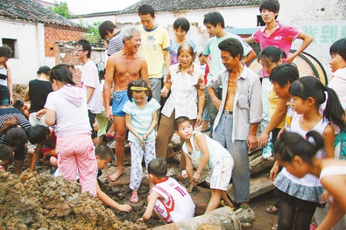 埋著銀元的泥土是來自樟三村中間的一處舊宅基地內(nèi),所以當(dāng)記者趕到那里時(shí),發(fā)現(xiàn)約100平方米的宅基地早被200多個(gè)村民堵得嚴(yán)嚴(yán)實(shí)實(shí),個(gè)個(gè)滿身泥污,掘地尋寶。