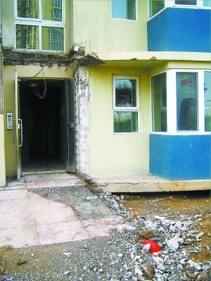 本報(bào)訊 據(jù)媒體報(bào)道,繼上海的“樓脆脆”后,京版“樓脆脆”也已現(xiàn)身——清河萊鎮(zhèn)香格里小區(qū)的11號樓門廳下陷,墻上破了兩個(gè)大洞,引起小區(qū)業(yè)主的擔(dān)憂和恐慌。今天上午記者在萊鎮(zhèn)小區(qū)的現(xiàn)場看到,塌陷的門廳已經(jīng)被拆卸。