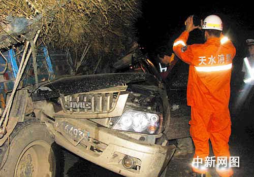 消防官兵到達(dá)現(xiàn)場(chǎng)后,發(fā)現(xiàn)一輛車號(hào)為川H64935的皮卡車撞進(jìn)與同向行駛的一輛車號(hào)為甘E03749載有秸桿的貨車左側(cè)的后輪胎處,“皮卡”車身嚴(yán)重?fù)p壞,地面血跡斑斑。車禍致“皮卡”車上一人當(dāng)場(chǎng)死亡,“皮卡”內(nèi)另有兩名傷者隨即被先行趕到的120急救車送往醫(yī)院救治。