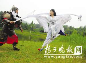 “江湖笑恩怨了,人過招心不老……”4日下午2點(diǎn),南京江寧區(qū)南山湖景區(qū)儼然成了古裝戲的外景地,3對年輕男女在此像模像樣地演繹個性“私人電影劇照”,——將《神話》、《神雕俠侶》、《十面埋伏》等古裝武俠電影中的經(jīng)典場景翻版演繹,用他們的話說,著實(shí)圓了一回都市人的“成人童話夢”。