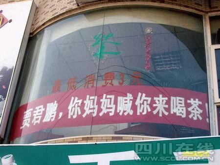再三追問下,來自重慶農(nóng)村的陳先生如實說,他平時喜歡上網(wǎng),看到“賈君鵬,你媽媽喊你回家吃飯”這句新的網(wǎng)絡(luò)流行語后,一下子勾起了自己童年的回憶,想起那個時候,每天傍晚,媽媽都要喊他回去吃飯的情景。而前兩天,他在網(wǎng)上看到一張照片,重慶的一家火鍋店竟然掛出一條橫幅,上面寫著:“賈君鵬,你媽媽喊你來吃火鍋!”他頓時靈機(jī)一動:“我為什么不能依葫蘆畫瓢,也掛一個橫幅呢?”“那為什么要寫成‘喝茶’呢?”陳先生說:“我這是茶樓,不管飯也不管吃火鍋,打麻將倒是可以,但總不能寫成‘賈君鵬,你媽媽喊你來打麻將’噻,所以就寫成來喝茶了!敝劣谶@橫幅有沒有給茶樓打廣告的意思,陳先生坦言:“也許有一點,但一來估計廣告的效果并不大,二來從自己的本意來說,娛樂的成分還要大過廣告的成分!