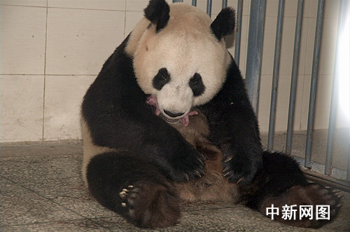 7日晨6點(diǎn)46分,“甜甜”開始出現(xiàn)產(chǎn)前征兆,8點(diǎn)13分破羊水,在經(jīng)過3個(gè)多小時(shí)的努力后生下一對健康的雙胞胎。初次當(dāng)媽媽的“甜甜”努力嘗試將寶寶叼在懷里,但小仔亂動(dòng)亂叫,很快又滑落到了地上,經(jīng)過多次努力,小仔終于在媽媽懷里安靜下來,“甜甜”用舌頭輕舔著寶寶的身體,儼然是位稱職的母親。產(chǎn)下第二仔以后,工作人員隨即將第一仔取出送往育嬰室進(jìn)行人工育幼,經(jīng)初步檢查,該寶寶是雄性,體重146.2克,各項(xiàng)身體指標(biāo)正常。